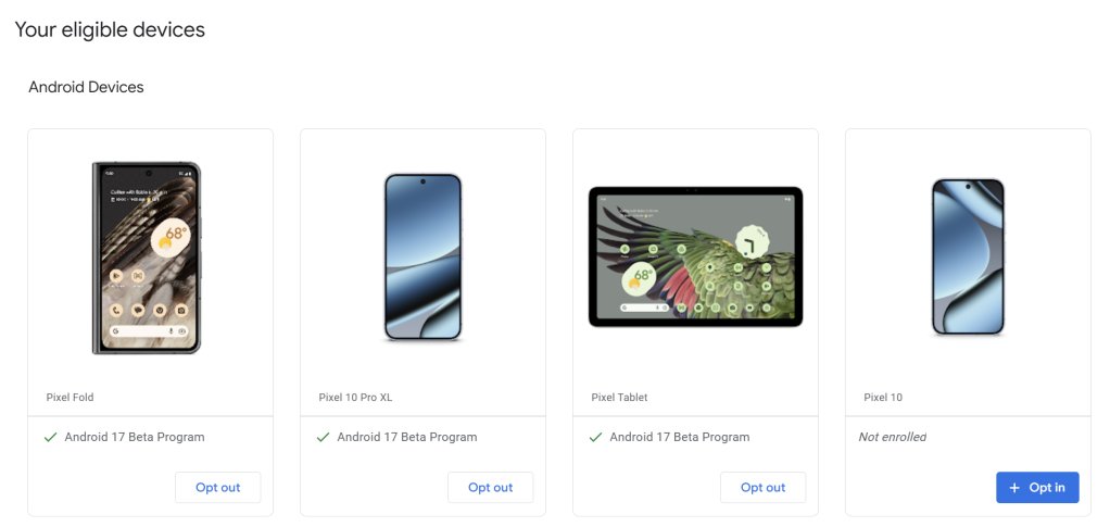 To get arrange with beta releases of Android 17, you’ll go to google.com/android/beta and “Choose in” in your chosen gadget. Any suitable Pixel (listed above) along with your identical Google account will have the ability to be part of this system on this web page. As soon as opted in, you’ll have the ability to examine for updates in your gadget to really set up the replace. This normally occurs inside a couple of minutes to an hour, however can sometimes take longer. You can even decide out of future updates from this web page.