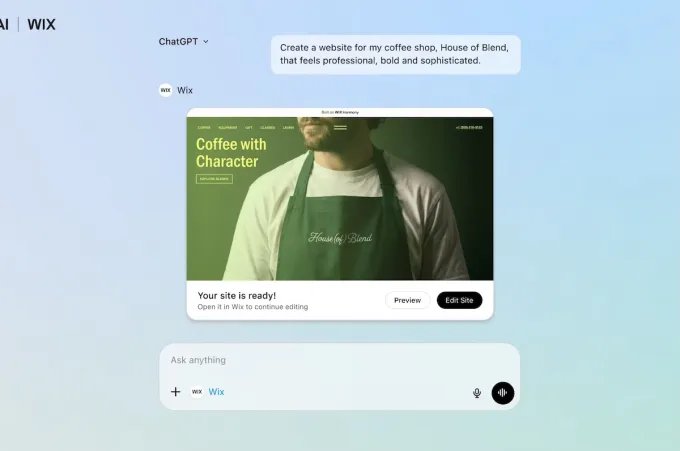 In March 2026, web site builder Wix launched its integration, permitting customers to immediate ChatGPT to create a purposeful web site with only a textual content or voice immediate. Customers can describe the capabilities they need the web site to have, the way it ought to look, and different desired options. Moreover, current Wix customers can handle their enterprise inside ChatGPT, which may deal with scheduling, funds, web optimization, accessibility, efficiency, safety, and extra.