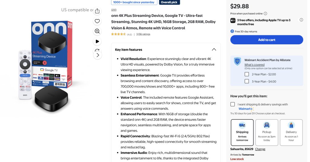 However, sadly, it’s additionally been out of inventory for a number of weeks. Each in-store and on-line, Onn 4K Plus has not been out there for buy. That’s till at present, once we observed it was immediately again in inventory.