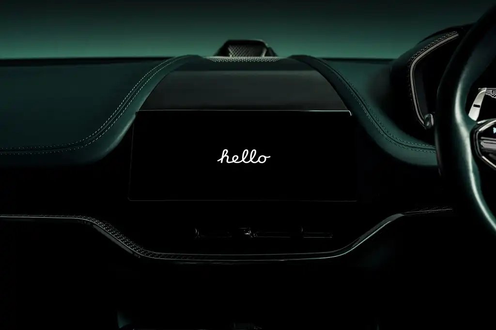 Aston Martin dashboard with Apple CarPlay Ultra saying hello